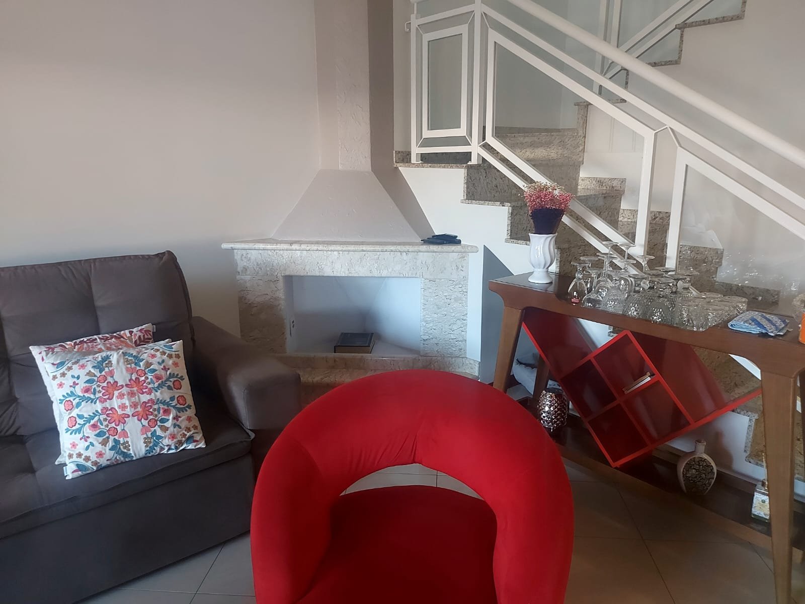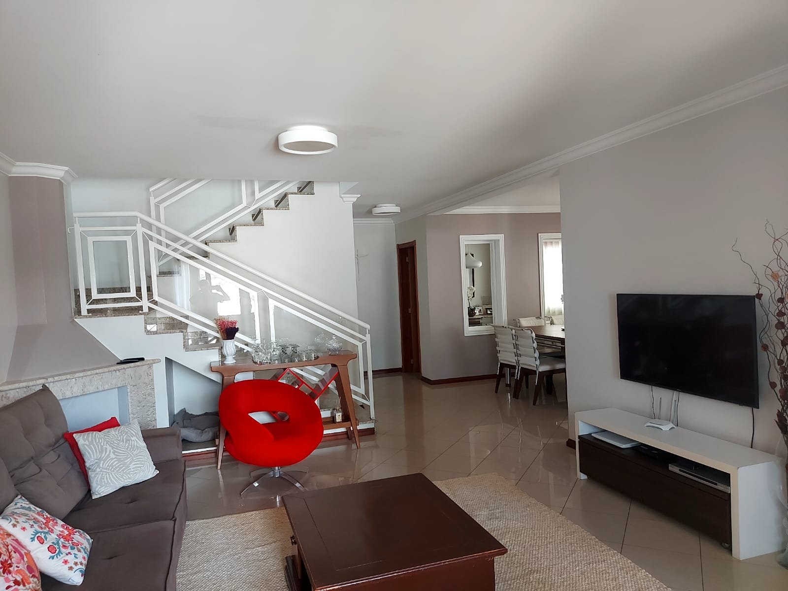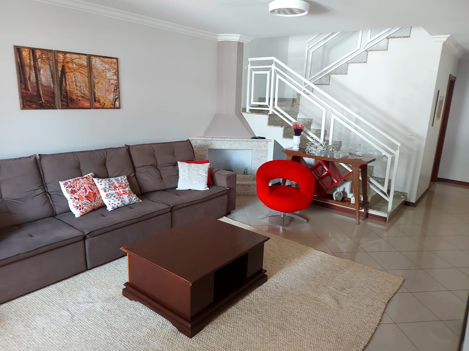 - Pisos: inferior com sala de TV, sala de jantar, lavabo, lareira e escritório